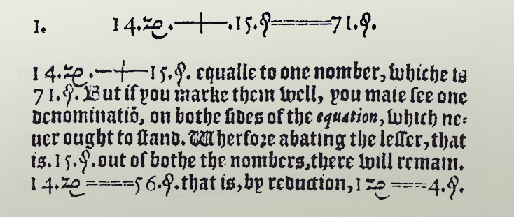 Das Symbol für Gleichheit "\(=\)" wurde 1557 erstmalig in einem englischen Lehrbuch eingeführt, hat sich aber erst langsam durchgesetzt. Noch zweihundert Jahre später war es beispielsweise üblich, für Gleichheit zwei senkrechte Striche \(||\) zu notieren, oder \(\mathrm{æ}\) bzw. \( \mathrm{œ}\) ("aequalis", Latein für "gleich").