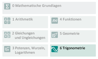 Im dazugehörigen Lernmodul werden die trigonometrischen Funktionen Sinus und Kosinus zunächst am rechtwinkligen Dreieck eingeführt und mit Hilfe des Einheitskreises auf beliebige Winkel (im Grad- und im Bogenmaß) erweitert. Grundlegende Eigenschaften und Beziehungen der trigonometrischen Funktionen werden hier wiederholt.