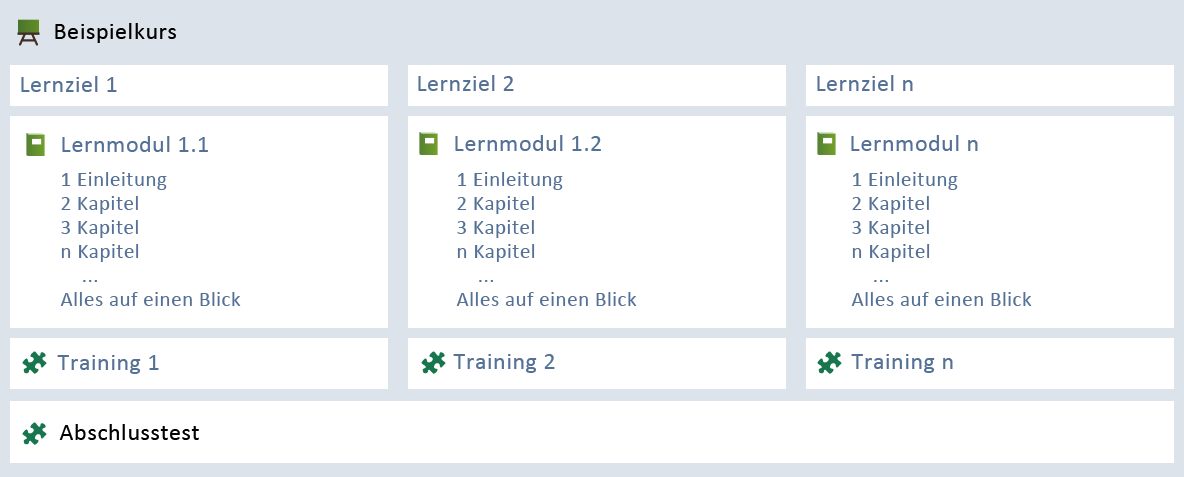 Zu jedem Lernziel gibt es ein Lernmodul und ein Training. Die Lernmodule bauen inhaltlich aufeinander auf, können also von Anfang bis Ende wie ein Lehrbuch durchgearbeitet werden. Es ist natürlich auch möglich, dass Sie sich nur einzelne Inhalte genauer anschauen.