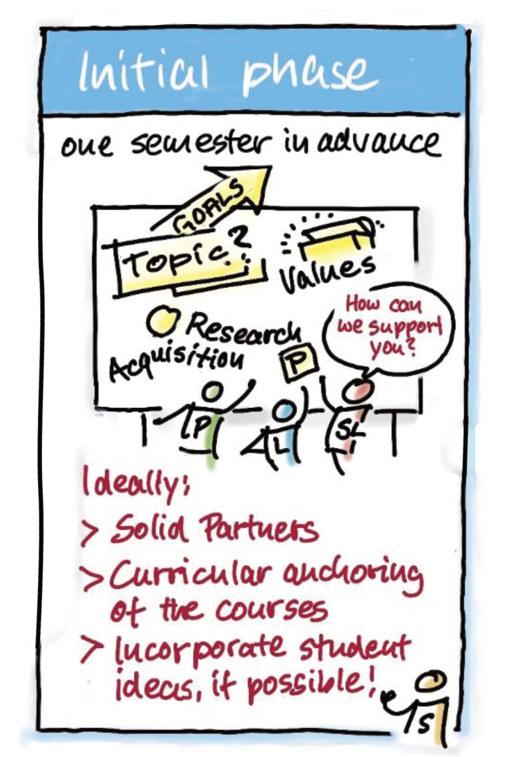 During this phase, it is also important to develop the content together with the community partners to enable a reciprocal partnership. In this way, everyone involved in the course works together on an equal footing. This means that they perceive themselves as equal partners and are open to learning from each other.