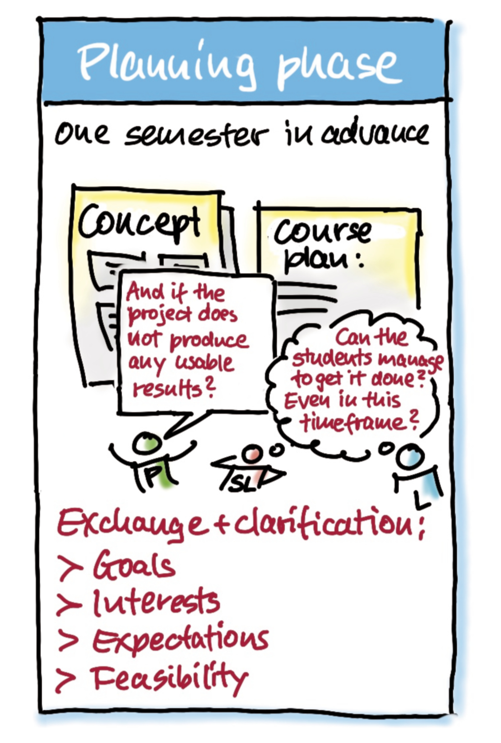 In the ensuing Planning Phase, everyone involved needs to identify precisely the desired learning and service elements, while maintaining a balance between the academic learning objectives and project goals. Doing so appreciatively and on an equal footing will foster the self-perception as equal partners and the willingness to learn from one another. Therefore, it is good to clarify mutual expectations, communicate any difficulties in a timely manner, discuss potential reflection opportunities and – overall – have a realistic expectation of what can be achieved over the course of the allocated time (e.g., in one or two semesters).
