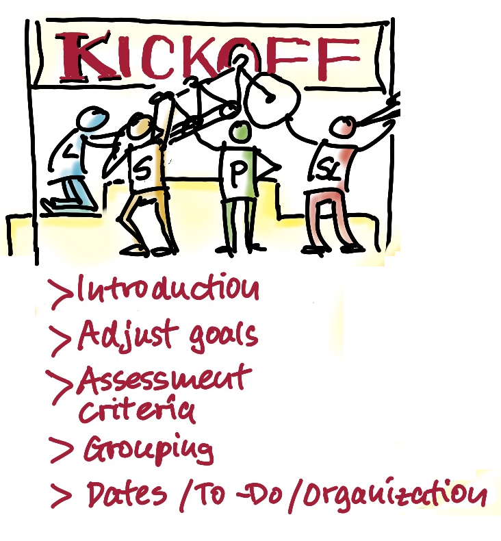 At a kick-off event, all participants become familiar with each other, the challenge ahead and organizational issues. Particularly in the first sessions, students should be helped to assess the achievability of goals realistically. This is also a suitable time for a first critical reflection on the suitability or unintended consequences of the service element (Crabtree, 2013). Any changes regarding the general goals should be made transparent.