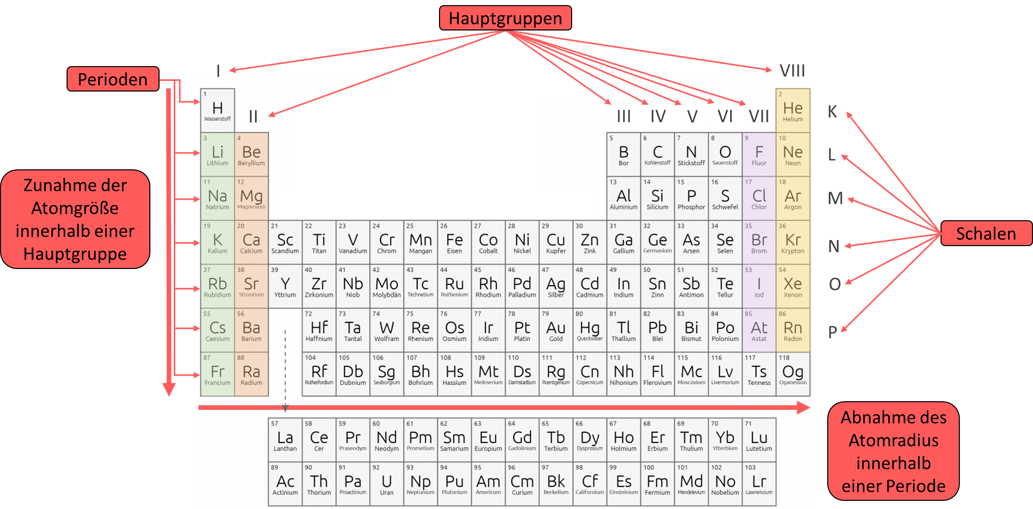 Einerseits nimmt von links nach rechts und von oben nach unten die Kernladungszahl (Ordnungszahl) zu. Untereinander in den Spalten (Hauptgruppe/Nebengruppe) sind Elemente mit ähnlichen chemischen Eigenschaften angeordnet.