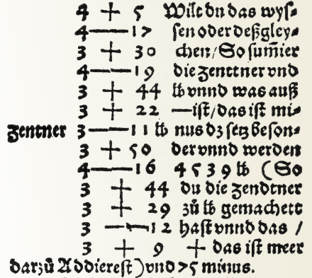 In der Abbildung sehen Sie ein Anwendungsbeispiel für eine kaufmännische Berechnung aus einem mathematischen Lehrbuch von Johannes Widmann (1460 – 1498). Es ist eines der ersten Beispiele für die Verwendung der Zeichen \(+\) und \(-\).