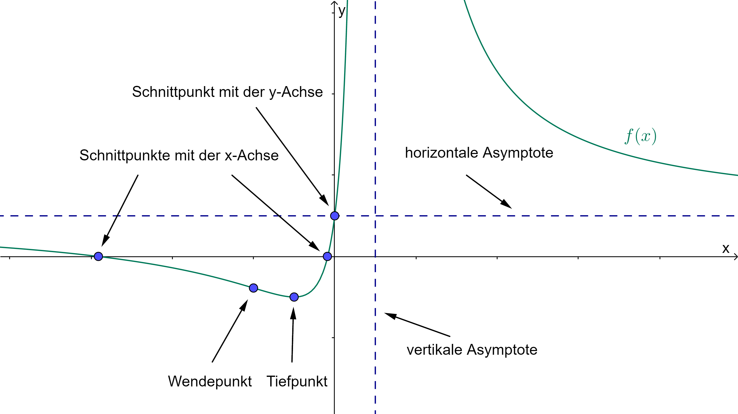 Unter einer Kurvendiskussion versteht man die Untersuchung des Schaubilds einer Funktion auf geometrische Eigenschaften. Wo hat die Funktion z.B. ihre Hoch- und Tiefpunkte? Wo liegen die Wendepunkte? Ist die Funktion symmetrisch? Welche Asymptoten hat die Funktion? Wie ist ihr Verhalten im Unendlichen?