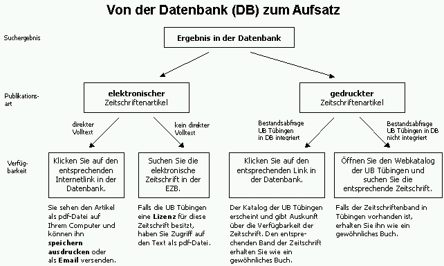 Haben Sie allerdings interessante Literatur in einer bibliographischen Datenbank gefunden, ist es nicht so einfach. Sie erinnern sich: in einer bibliographischen Datenbank sind keine Standortvermerke, nur Hinweise auf die Existenz der Literatur festgehalten. Folgendes Schaubild verdeutlicht die weitere Vorgehensweise: