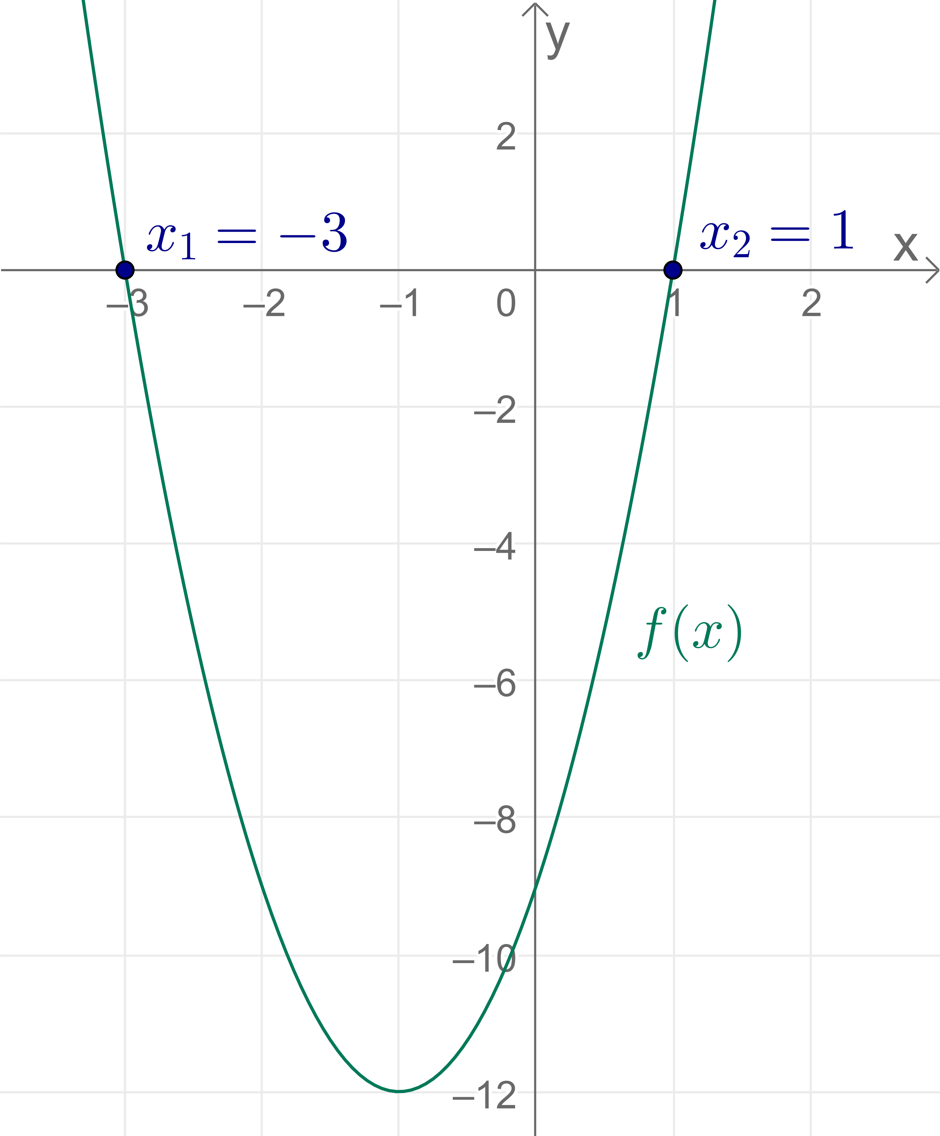 Bestimmen Sie die Nullstellen der folgenden quadratischen Funktion: \(\qquad \begin{array} {r c l c l } f & : & \mathbb R & \longrightarrow & \mathbb R \\ & & x & \longmapsto & 3x^2+6x-9 \end{array}\) Erklärung Lösung: Die Nullstellen lauten: \(\qquad x_1 = -3\quad\) und \(\quad x_2 = 1\) Erläuterung: Wir haben die quadratische Gleichung \(\qquad 3x^2 + 6x - 9 = 0\) zu lösen. Zur Lösung benutzen wir die quadratische Ergänzung: \(\qquad \begin{array} {} 3 x^2 + 6 x - 9 & = & 0 & \iff \\ 3 \left( x^2 + 2x \right) - 9 & = & 0 & \iff \\ 3 \left( x^2 + 2x + 1 \right) - 3 - 9 & = & 0 & \iff \\ 3 \left( x+1 \right)^2 & = & 12 & \iff \\ \left( x+1 \right)^2 & = & 4 & \iff \\ x + 1 & = & \pm 2& \iff \\ x & = & -1\pm 2 \end{array}\) Wir erhalten die beiden Lösungen \(\qquad x_1 = -3\quad\) und \(\quad x_2 = 1\) Alternativ hätten wir die Nullstellen auch über die \(abc\)-Formel berechnen können oder mithilfe des Satzes von Vieta. ![]() | ![]() |