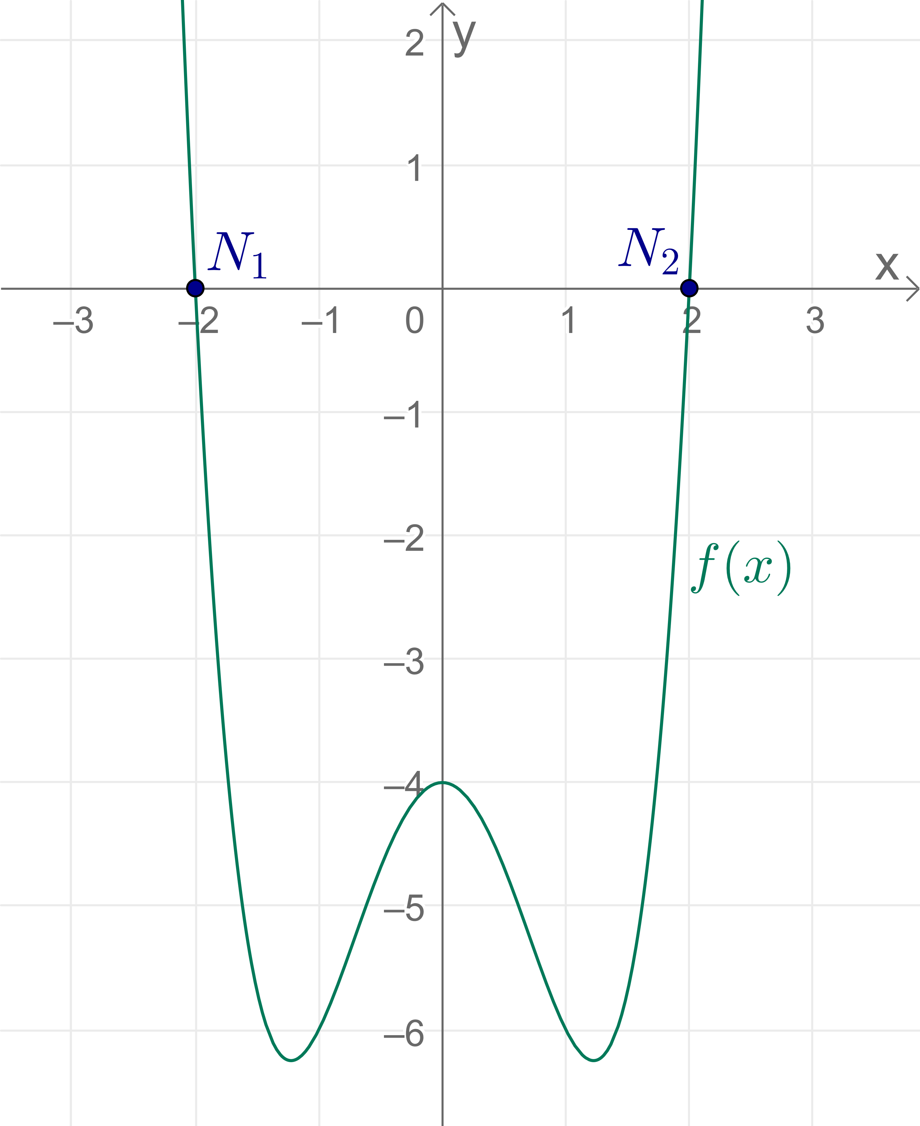Die Funktion hat also die beiden Punkte \(N_1({-2}\,|\,0)\) und \(N_2(2\,|\,0)\) mit der \(x\)-Achse gemeinsam. Der Faktor \((x^2+1)\) in der obigen Faktorzerlegung der Funktion kann in \(\mathbb{R}\) nicht weiter zerlegt werden. Der Faktor \((x^2-4)\) lässt sich in \((x-2)(x+2)\) zerlegen. Wir erhalten also die folgende Faktorform: \(\qquad f(x)=(x+2)(x-2)(x^2+1)\) ![]() | ![]() |