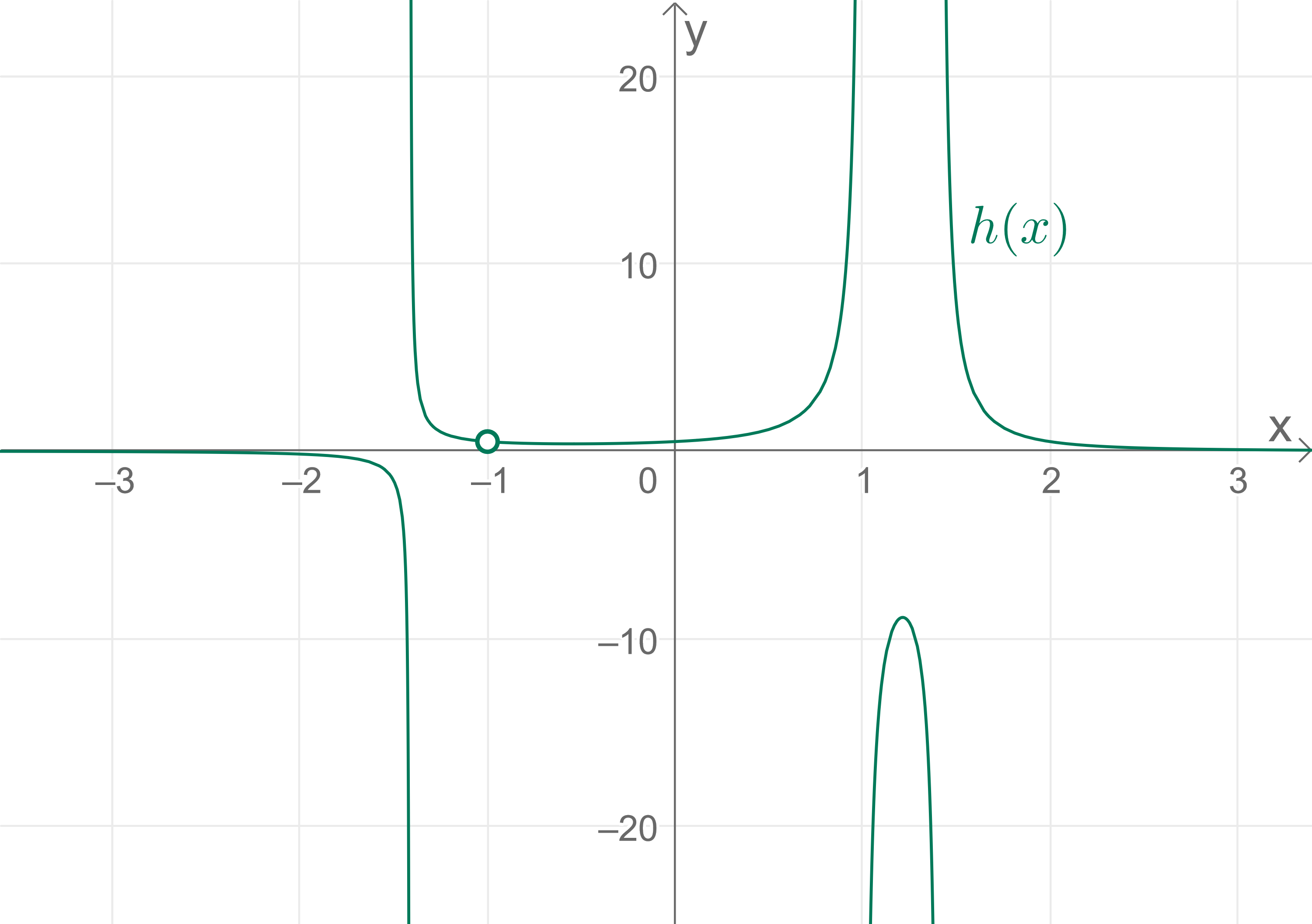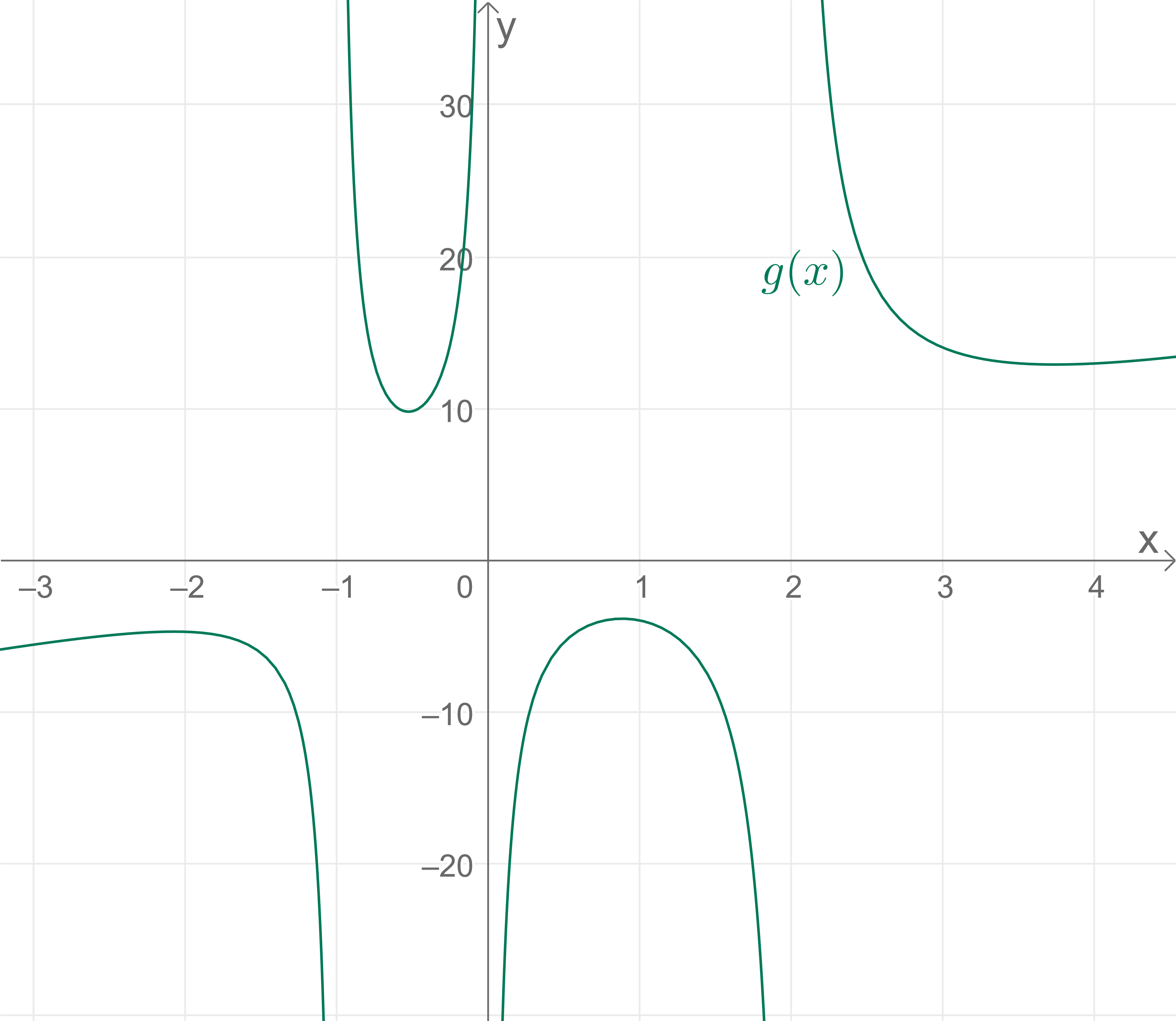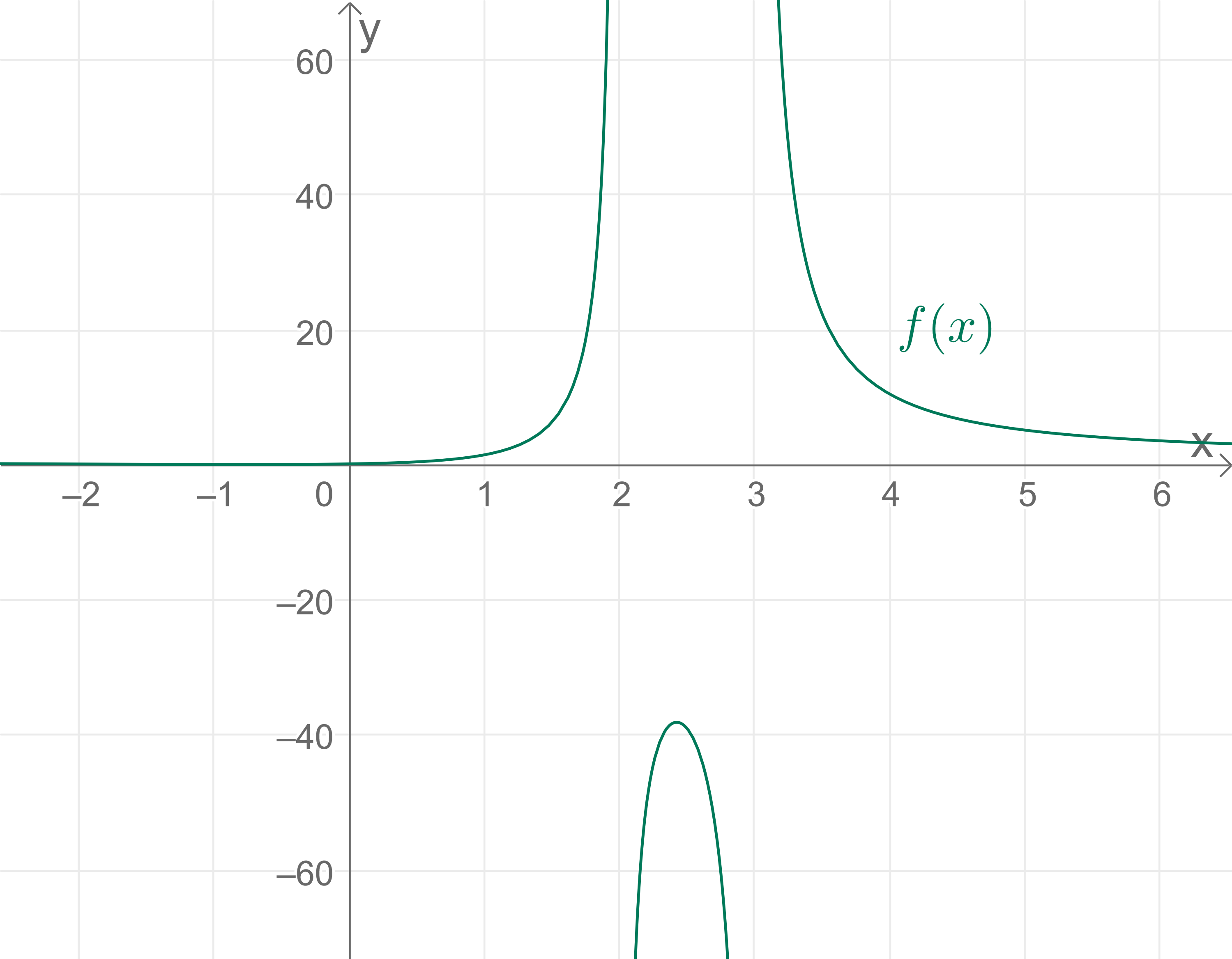 Erklärung von a) \(f(x) = \dfrac {x^2 + x + 1}{x^2- 5x + 6}\) Lösung: Der maximale Definitionsbereich lautet: \(\qquad D_f=\mathbb{R}\setminus \{2,3\}\) Erläuterung: Wir suchen die Definitionslücken der Funktion, d.h. die Stellen, an denen der Nenner den Wert \(0\) annimmt. Der maximale Definitionsbereich sind die reellen Zahlen ohne die Definitionslücken. Mit der \(pq\)-Formel erhalten wir die Nullstellen von \(x^2- 5x + 6\): \(\qquad x_{1,2}=\frac{5}{2}\pm\sqrt{\frac{25}{4}-6}=\frac{5}{2}\pm\frac{1}{2}\) \(\qquad x_1=\frac{5}{2}-\frac{1}{2}=2\) \(\qquad x_2=\frac{5}{2}+\frac{1}{2}=3\) Der maximale Definitionsbereich lautet: \(\qquad D_f=\mathbb{R}\setminus \{2,3\}\) Um den Ursprung herum hat die Funktion das folgende Aussehen: ![]() Betrachtet man das Schaubild der Funktion mit einer anderen Skalierung, dann erkennt man, dass auch Teile des Schaubilds im 4. Quadranten liegen. ![]() Erklärung von b) \(g(x) = \dfrac { 2x^4 + 6}{x^3 - x^2 -2x}\) Lösung: Der maximale Definitionsbereich lautet: \(\qquad D_g=\mathbb{R}\setminus \{-1,0,2\}\) Erläuterung: Wir suchen die Definitionslücken der Funktion, d.h. die Stellen, an denen der Nenner den Wert \(0\) annimmt. Der maximale Definitionsbereich sind die reellen Zahlen ohne die Definitionslücken. Mit dem Satz vom Nullprodukt und der \(pq\)-Formel erhalten wir die Nullstellen von \(x^3 - x^2 -2x\): \(\qquad x^3 - x^2 -2x=x(x^2 - x -2)=0\) Nach dem Satz vom Nullprodukt ist die Gleichung dann \(0\), wenn einer der Faktoren \(0\) wird. Wir betrachten den ersten Faktor: \(\qquad x=0\) und erhalten die erste Nullstelle \(x_1=0\). Außerdem muss der zweite Faktor den Wert \(0\) annehmen: \(\qquad x^2 - x -2=0\) Diese Gleichung lösen wir mit der \(pq\)-Formel und erhalten: \(\qquad x_{2,3}=\frac{1}{2}\pm\sqrt{\frac{1}{4}+2}=\frac{1}{2}\pm\frac{3}{2}\) \(\qquad x_2=\frac{1}{2}-\frac{3}{2}=-1\) \(\qquad x_3=\frac{1}{2}+\frac{3}{2}=2\) Der maximale Definitionsbereich lautet: \(\qquad D_g=\mathbb{R}\setminus \{-1,0,2\}\) ![]() Erklärung von c) \(h(x) = \dfrac {x+1}{x^4-3x^2+2}\) Lösung: Der maximale Definitionsbereich lautet: \(\qquad D_h=\mathbb{R}\setminus \{-\sqrt{2},-1,1,\sqrt{2}\}\) Erläuterung: Wir suchen die Definitionslücken der Funktion, d.h. die Stellen, an denen der Nenner den Wert \(0\) annimmt. Der maximale Definitionsbereich sind die reellen Zahlen ohne die Definitionslücken. Mit Substitution und der \(pq\)-Formel erhalten wir die Nullstellen von \(x^4-3x^2+2\): Substitution: \(\qquad u=x^2\qquad u^2=x^4\) \(\qquad u^2-3u+2=0\) \(\qquad u_{1,2}=\frac{3}{2}\pm\sqrt{\frac{9}{4}-2}=\frac{3}{2}\pm\frac{1}{2}\) \(\qquad u_1=\frac{3}{2}-\frac{1}{2}=1\) \(\qquad u_2=\frac{3}{2}+\frac{1}{2}=2\) Resubstitution: \(\qquad u_1=x^2=1\qquad x_1=-1\qquad x_2=1\) Resubstitution: \(\qquad u_2=x^2=2\qquad x_3=-\sqrt{2}\qquad x_4=\sqrt{2}\) Der maximale Definitionsbereich lautet: \(\qquad D_h=\mathbb{R}\setminus \{-\sqrt{2},-1,1,\sqrt{2}\}\) ![]() | ![]() |