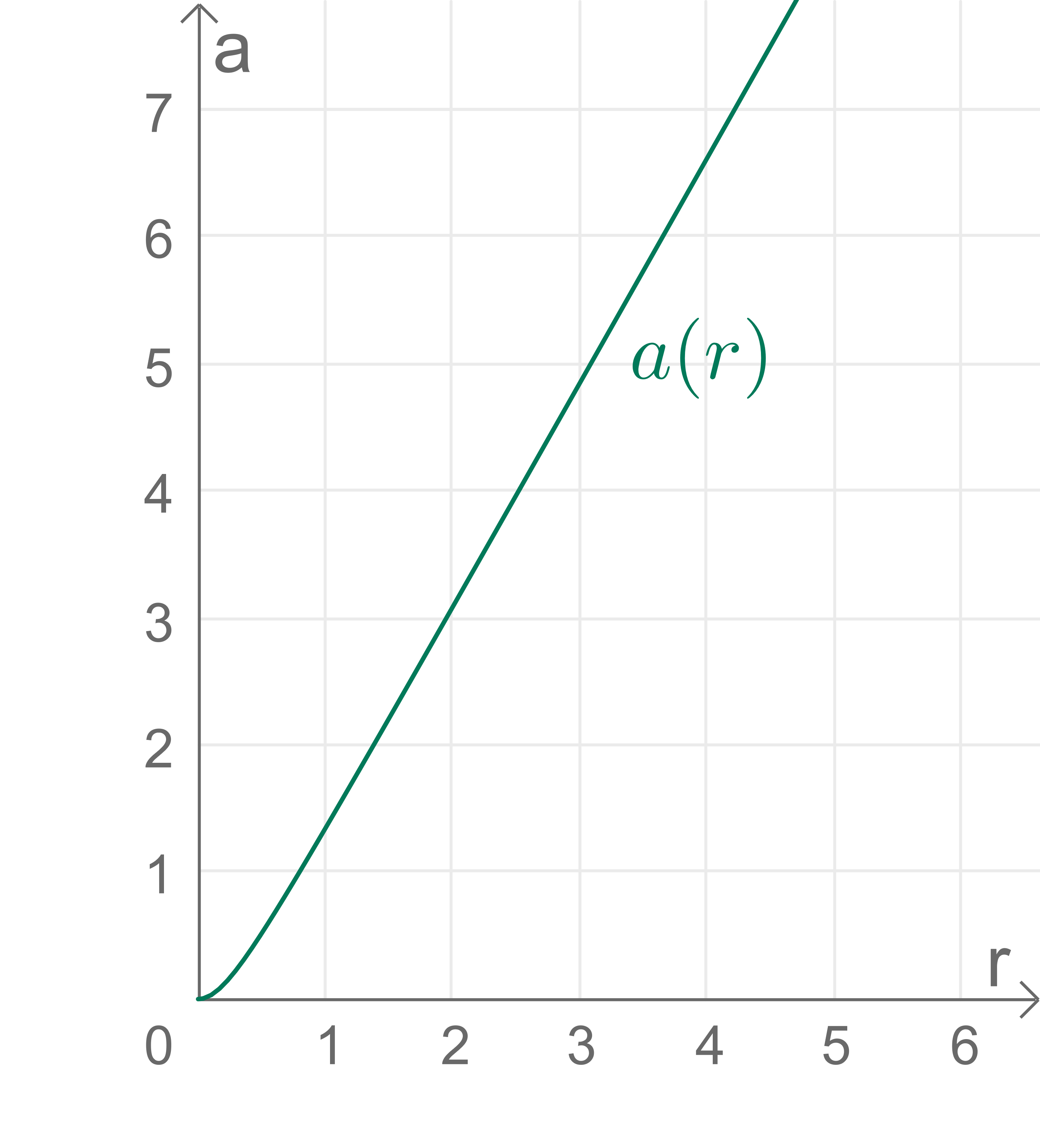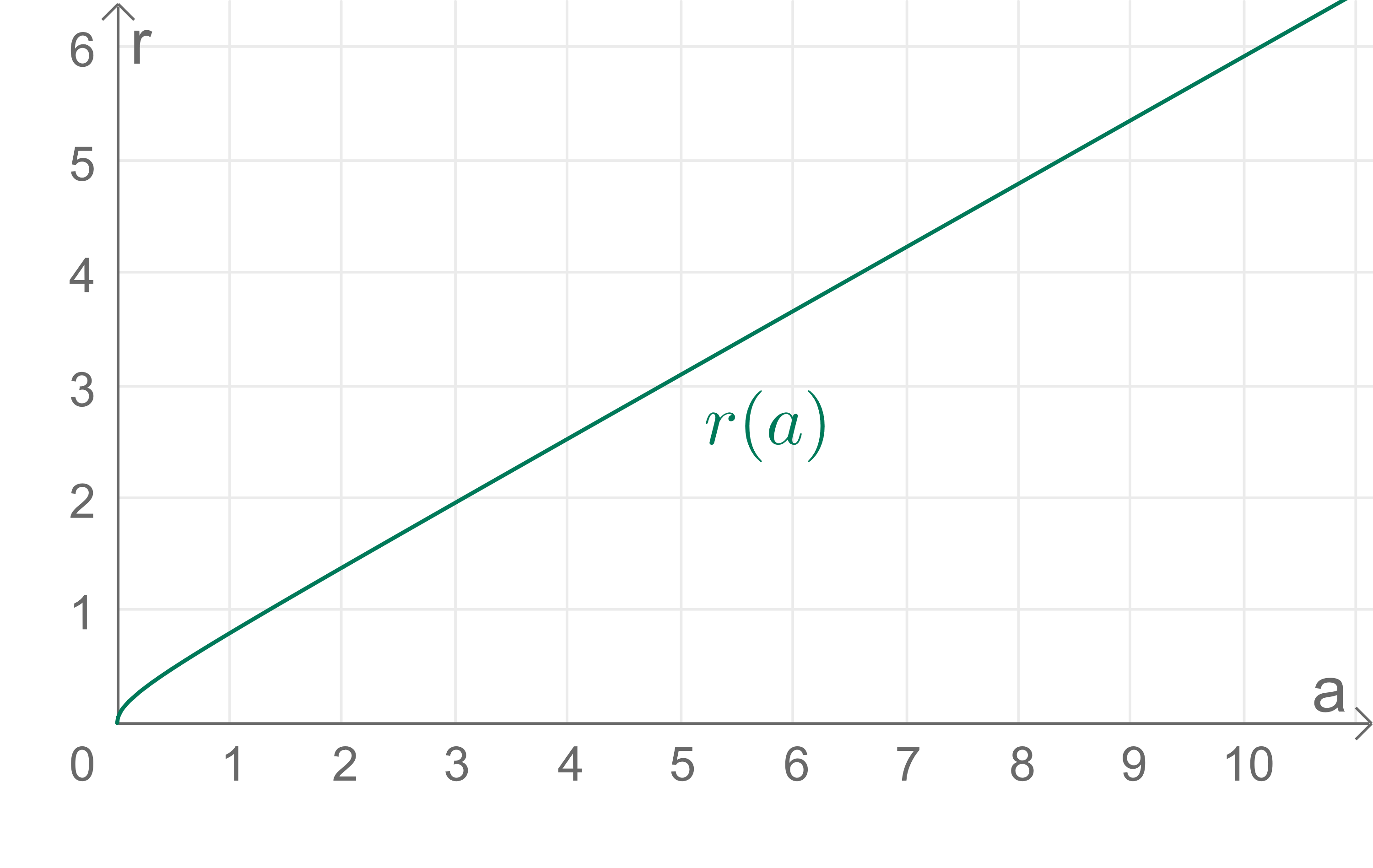 Erklärung zu a) Lösung: Die Funktion, die die Seitenlänge \(a\) der kürzeren Seite des Rechtecks in Abhängigkeit vom Radius \(r\) des Kreises beschreibt, lautet: \(\qquad a: [0, \infty[ \longrightarrow \mathbb R\qquad\) mit \(\quad a(r) =-\dfrac{1}{2}+ \sqrt{\pi \cdot r^2+\dfrac{1}{4}}\) Erläuterung: Die Fläche des Rechtecks mit Seitenlänge \(a\) der kürzeren Seite lautet: \(\qquad A(a)=a(a+1)=a^2+a\) Die Fläche eines Kreises mit Radius \(r\) ist gegeben durch: \(\qquad A(r)=\pi \cdot r^2\) Da das Rechteck den gleichen Flächeninhalt wie der Kreis aufweist, können wir die Flächen gleichsetzen und erhalten: \(\qquad A(a)=A(r)\) \(\qquad a^2+a=\pi\cdot r^2\) Wir lösen die Gleichung nach \(a\) auf: \(\qquad a^2+a-\pi\cdot r^2=0\) \(\qquad a_{1,2}=-\dfrac{1}{2}\pm\sqrt{\pi\cdot r^2+\dfrac{1}{4}}\) Da Seitenlängen nur positiv sind, erhalten wir als gesuchte Funktion: \(\qquad a: [0, \infty[ \longrightarrow \mathbb R\qquad\) mit \(\quad a(r) =-\dfrac{1}{2}+ \sqrt{\pi \cdot r^2+\dfrac{1}{4}}\) ![]() Erklärung zu b) Lösung: Die Funktion, die den Radius \(r\) des Kreises in Abhängigkeit von der kürzeren Seitenlänge \(a\) des Rechtecks beschreibt, lautet: \(\qquad r: [0, \infty[ \longrightarrow \mathbb R\qquad\) mit \(\quad r(a) = \sqrt{\dfrac{a^2+a}{\pi}}\) Erläuterung: Die Fläche eines Rechtecks mit Seitenlänge \(a\) der kürzeren Seite lautet: \(\qquad A(a)=a(a+1)=a^2+a\) Die Fläche eines Kreises mit Radius \(r\) ist gegeben durch: \(\qquad A(r)=\pi \cdot r^2\) Da das Rechteck den gleichen Flächeninhalt wie der Kreis aufweist, können wir die Flächen gleichsetzen und erhalten: \(\qquad A(a)=A(r)\) \(\qquad a^2+a=\pi\cdot r^2\) Wir lösen die Gleichung nach \(r\) auf: \(\qquad r^2=\dfrac{a^2+a}{\pi}\) \(\qquad r=\sqrt{\dfrac{a^2+a}{\pi}}\) Unsere gesuchte Funktion lautet: \(\qquad r: [0, \infty[ \longrightarrow \mathbb R\qquad\) mit \(\quad r(a) = \sqrt{\dfrac{a^2+a}{\pi}}\) ![]() | ![]() |