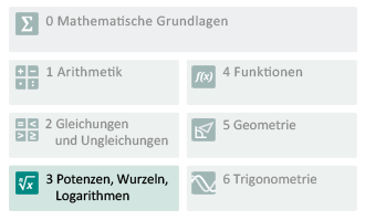 Der Kurs "3 Potenzen, Wurzeln, Logarithmen" ist für eine Bearbeitungszeit von 10 bis 12 Stunden ausgelegt. Dies ist allerdings nur ein Richtwert. Je nach Vorwissen und individuellem Tempo kann es natürlich sein, dass Sie mehr oder deutlich weniger Zeit benötigen. (Ein entsprechender Zeitplan kann Ihnen zur Planung ihrer individuellen Lernzeit behilflich sein.)